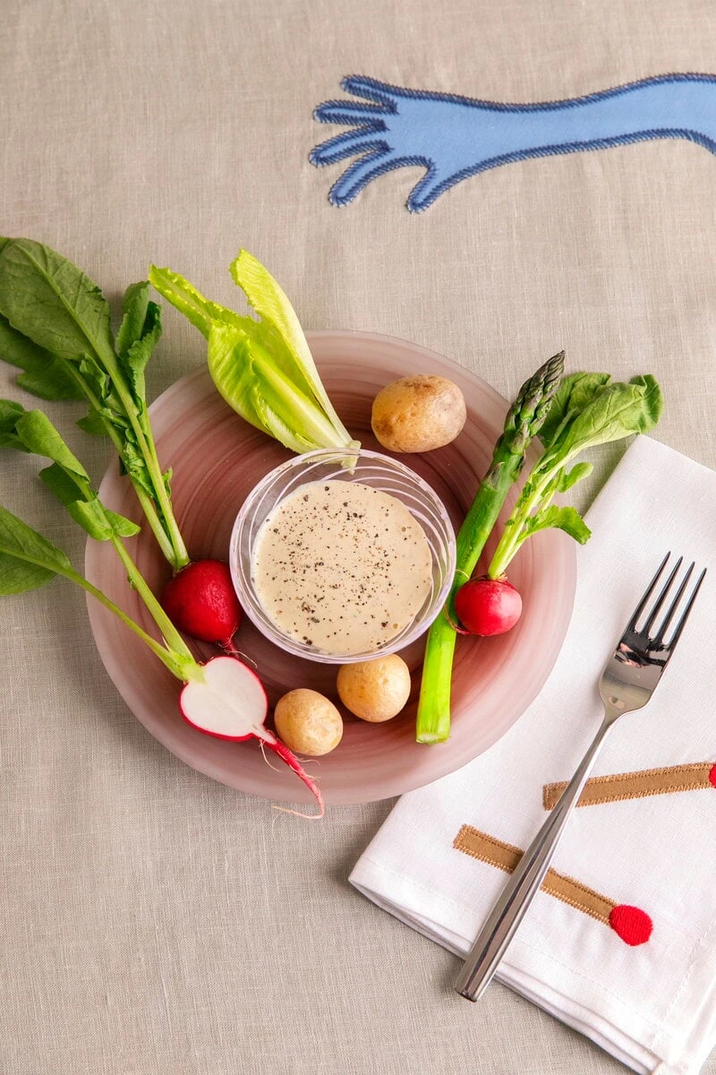HAY’s Sobremesa napkin is a cheerful serviette created by Egyptian chef and artist, Laila Gohar, designed to make setting the table and dining an experiential affair. Decorated with quirky embroidery and appliquéd patterns, the napkins made of a linen blend serve as a fun and functional detail for both casual and festive settings.